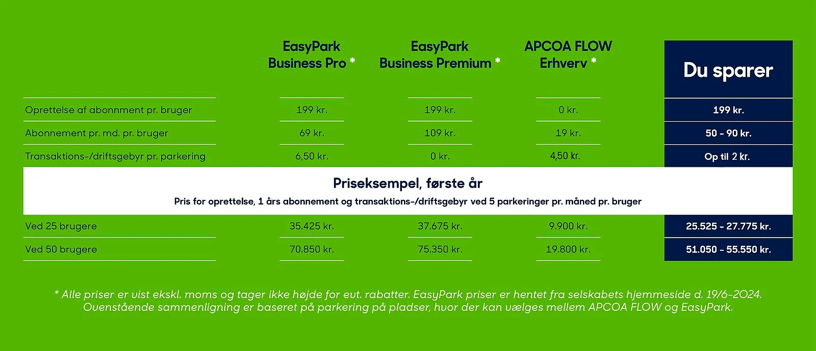 Prisen for at være APCOA FLOW Erhverv-medlem er markant lavere end gængse konkurrenters. Det koster kun 19 kr. eks. moms pr. mdr. pr. bruger, hvor andre udbydere tager helt op til 109 kr. eks. moms pr. mdr. pr. bruger. Vi har intet oprettelsesgebyr på brugere; andre erhvervsudbydere tager op til 199 kr. eks. moms pr. bruger.